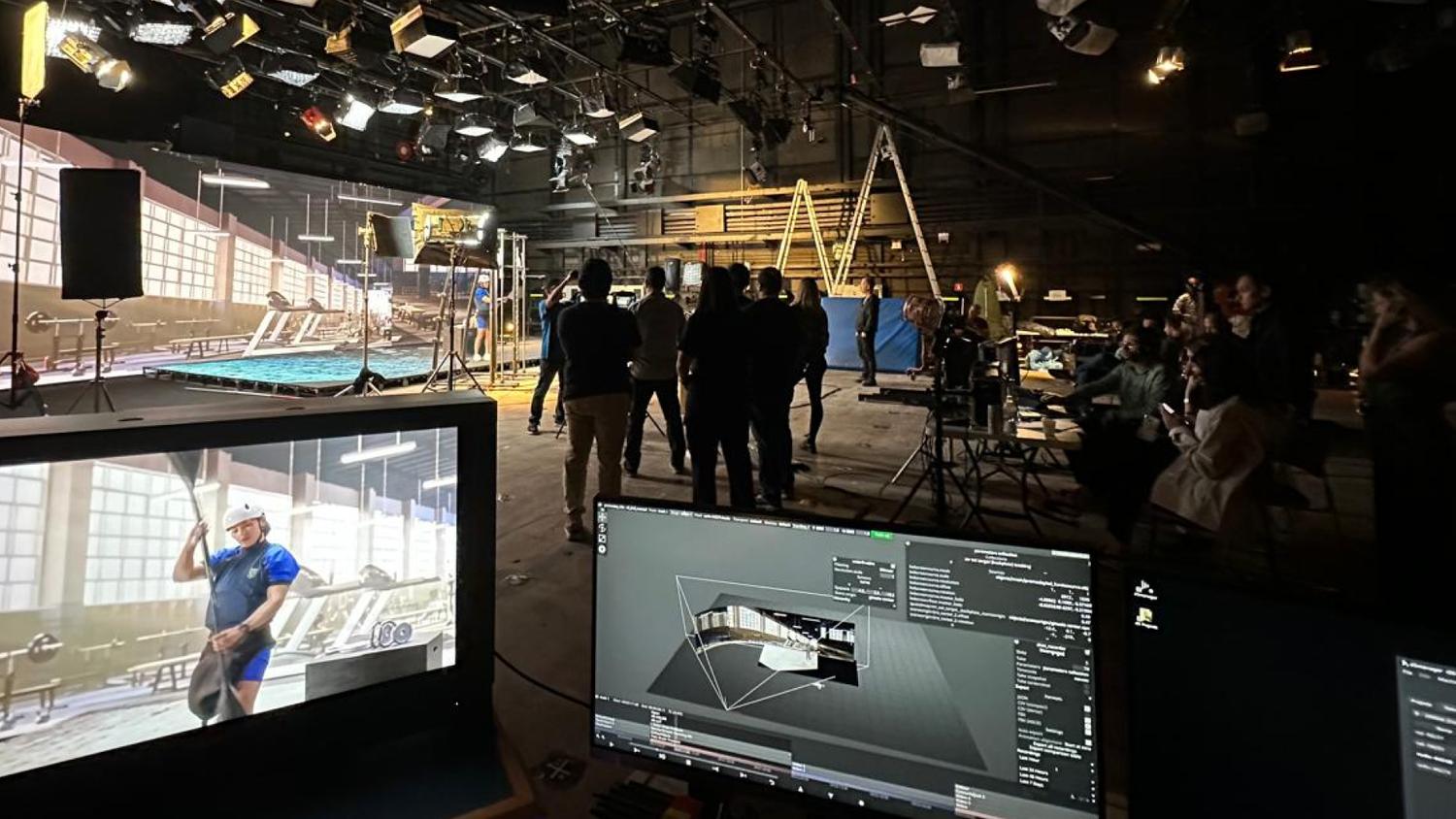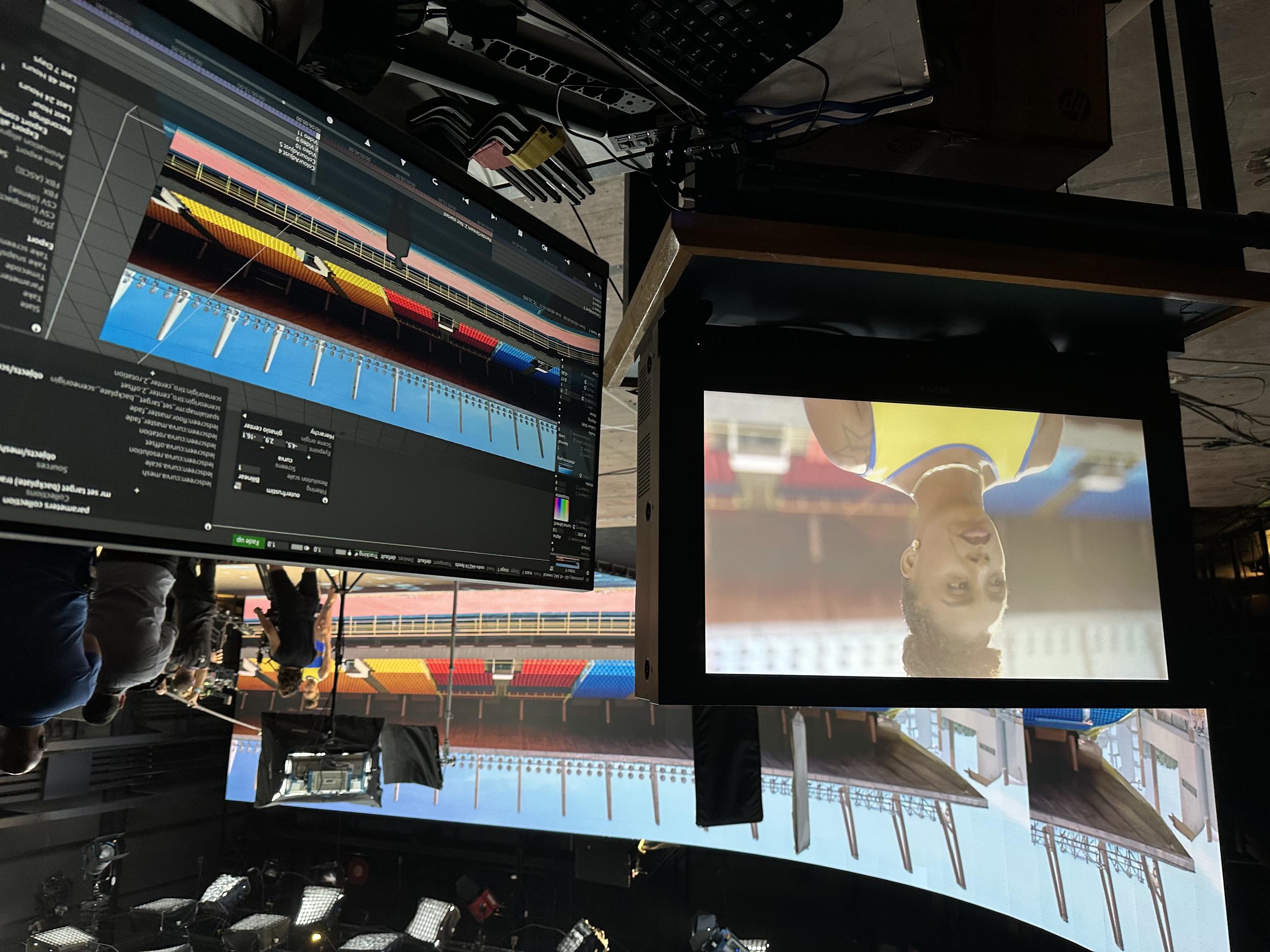 Para isso, utilizamos a tecnologia da Disguise, plataforma que permite renderizar gráficos em tempo real, possibilitando ajustes instantâneos durante a filmagem, além da sincronização de múltiplos elementos visuais, assegurando que todos os componentes da produção estejam perfeitamente alinhados.